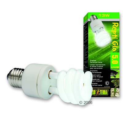 Reptil Glo 5.0 Exo Terra tiene de una moderada a alta emisión UVB similar a los ambientes sombreados tales como bosques lluviosos y otras localidades tropicales. Los reptiles que viven en esos hábitats reciben poca radiación UV por las variadas co
