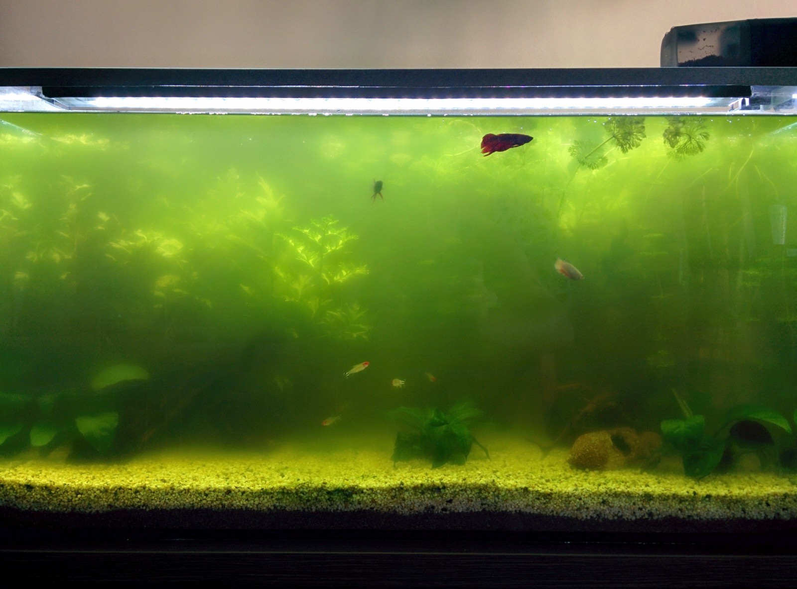 - En caso de tener agua verde en nuestro acuario, algunos acuaristas utilizan pulgas de agua, aunque este es un método poco frecuente y lento, además que nuestros peces se comerían a las pulgas de agua en minutos. Otros acuaristas utilizan un filtro UV para eliminar esta alga, pero dejemos en claro que se pueden eliminar otros organismos además de las algas. El sistema más sencillo sigue siendo el cambio de agua, además del más barato. Además podemos dejar oscuro el acuario por unos 3-4 días. Algunos acuaristas utilizan carbón activo en sus filtros durante el tiempo que dura el agua verde, otro método que en mi caso he visto documentado en algunos sitios de Internet, consiste en introducir una rama de sauce dentro del acuario y dejando una sección de unos 15 a 20 cm fuera del agua, lo que ayuda a combatirla rápidamente.