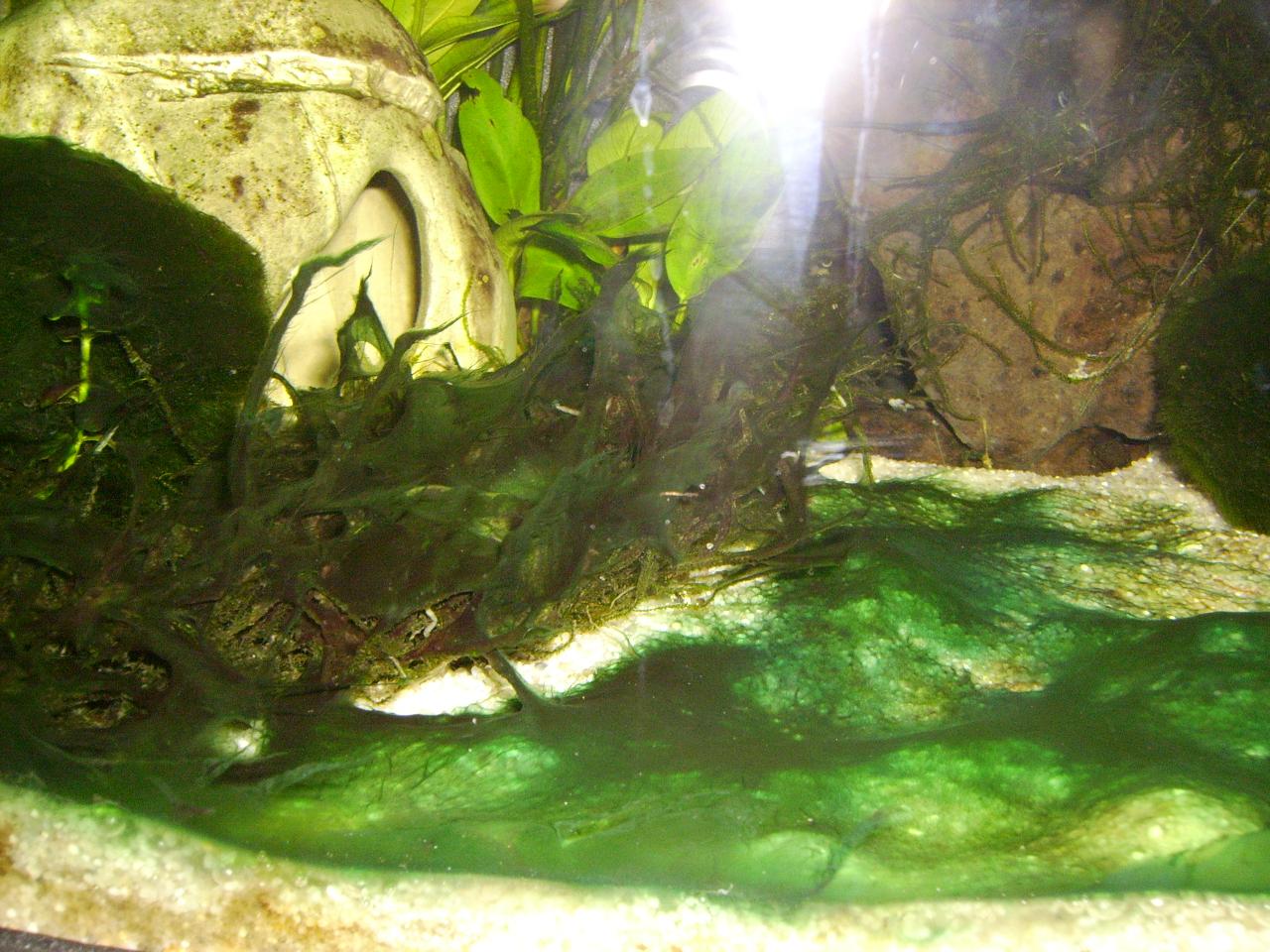 Causas de su aparición: En los textos y publicaciones que he consultado, dan diversas causas de la aparición de este tipo de alga, como por ejemplo, una excesiva contaminación del agua (sobre todo por nitrato y fosfato), otra causa es la falta de potasio en las plantas, exceso de comida seca, fondo en putrefacción, falta de CO2, demasiada luz y un valor de pH muy alto. De por si este tipo de algas aparecen con pH alcalinos.