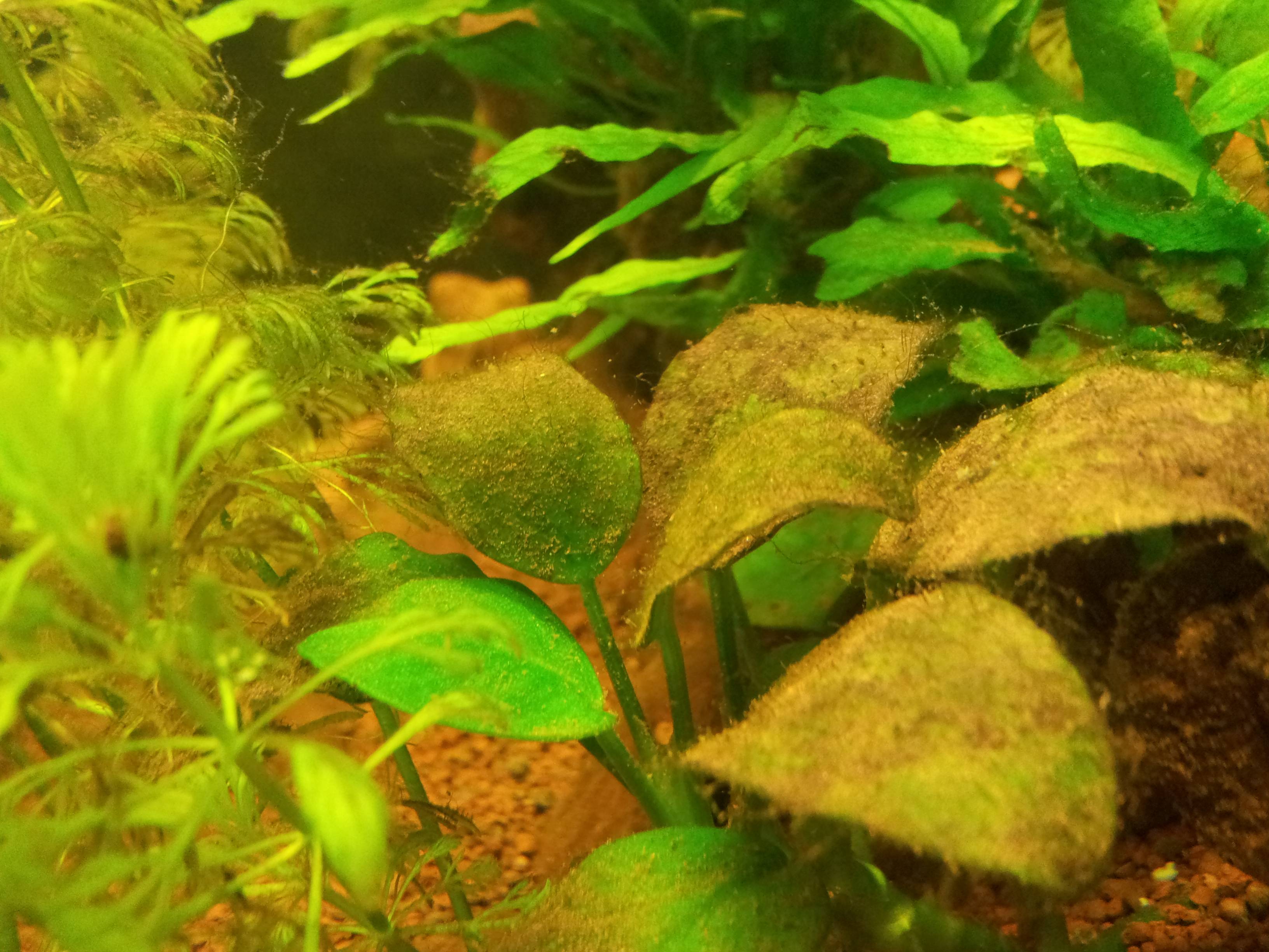 - Para las algas punto verde, estas pueden ser removida mecánicamente a través del raspado con algo filoso (una hoja de afeitar por ejemplo). Las hojas muy afectadas por este tipo de alga deben ser retiradas. Al llevar un momento de poder controlar esta alga, podemos dejar en el cristal del fondo del acuario esta alga como alimento vegetal para peces y caracoles.