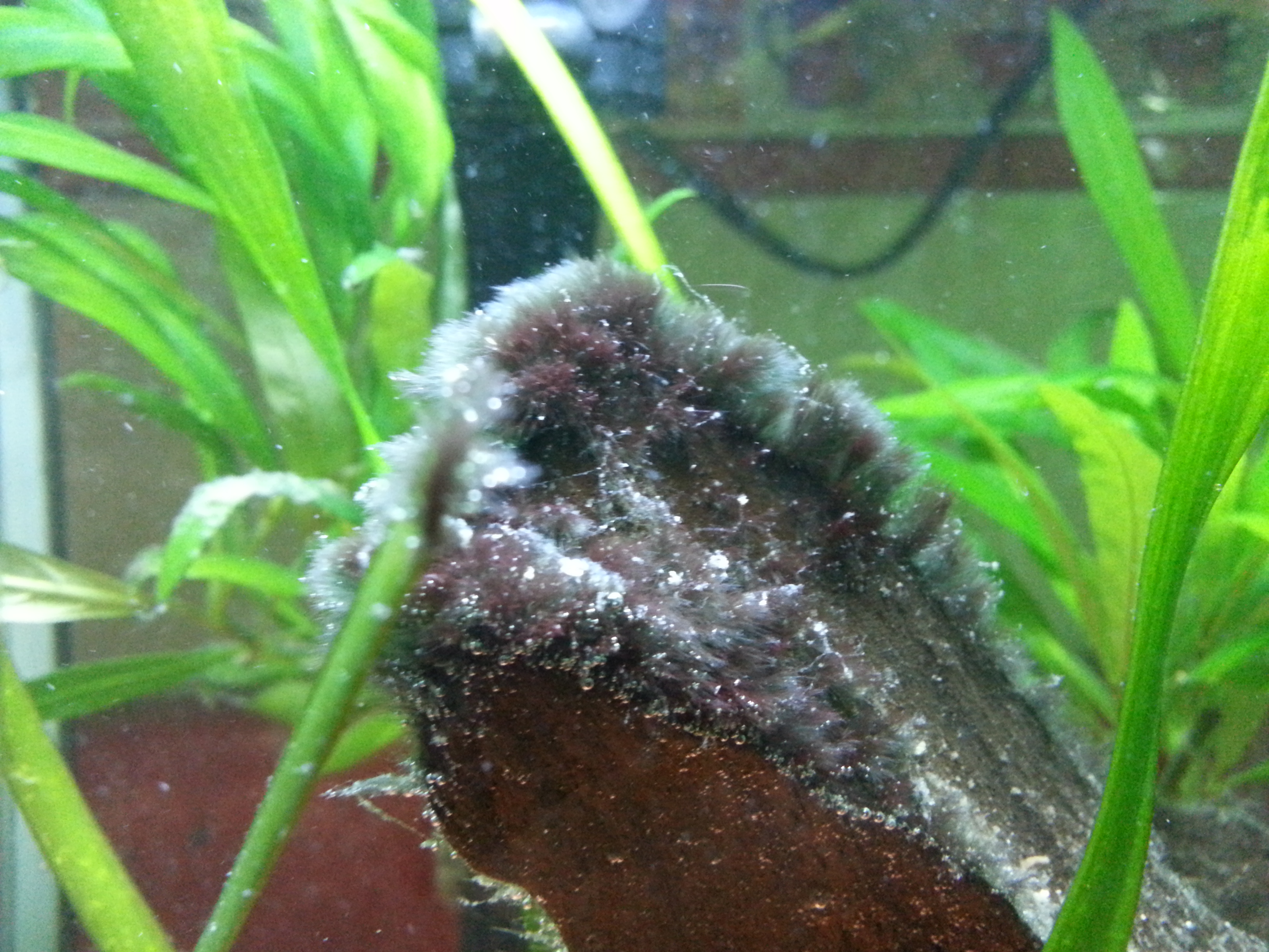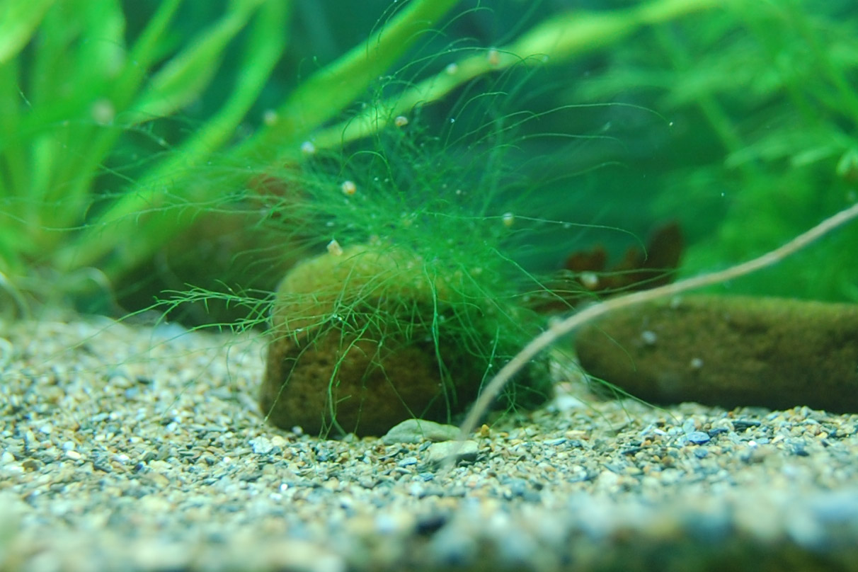- Para las algas hebra y pelo podemos retirarlas enrollándolas por ejemplo en un cepillo de dientes. Para aquellas personas que lo deseen, pueden dejar este tipo de algas como refugio para los alevines. Las algas mechón a mi parecer, son muy decorativas sobre todo sobre los caracoles, estas si deseamos las podemos dejar, pues alojan muchas veces infusorios minúsculos que algunos peces consumen como complemento a su alimentación, pero, si queremos podemos retirarlas manualmente.